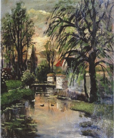 1115, Brug met boot en wasvrouw, olie/doek, Dijkman, 80 x 60