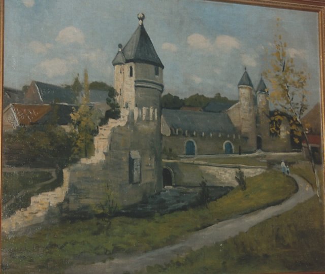 0705, Kasteel en kerk van Borgharen (gezien vanaf de Middenstraat), olieverf/doek, Henk Dijkman, 30 x 40
